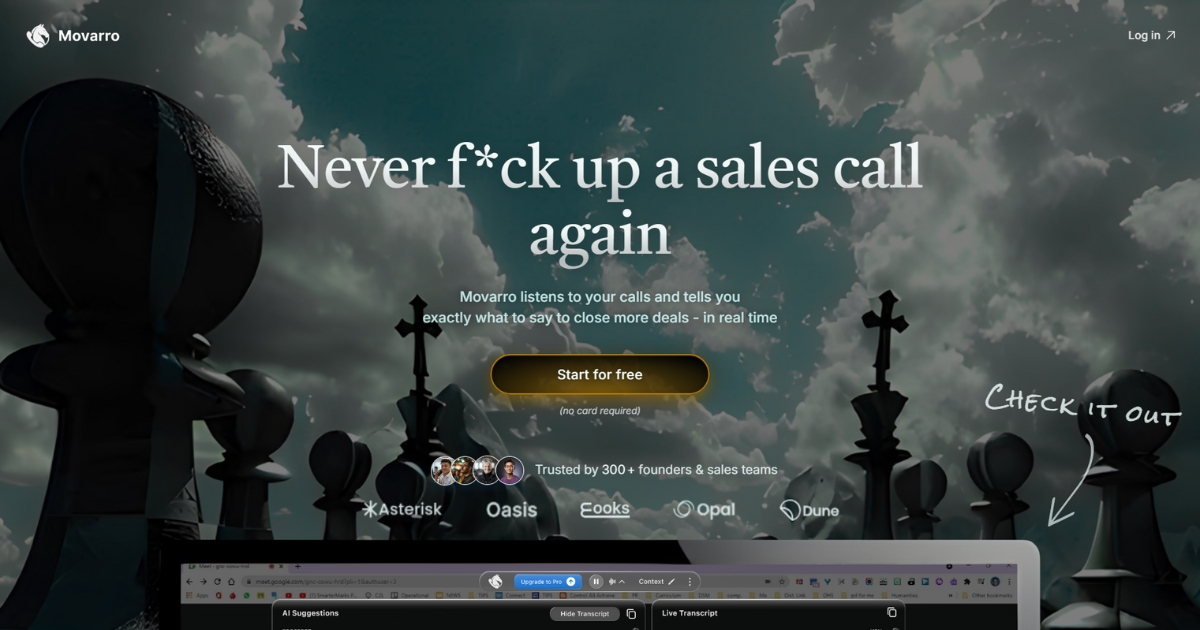 Movarro is built for founders looking to make the most out of their sales calls. If you're nervous for or new to sales calls, Movarro will help you overcome your fear of fumbling and losing clients by telling you exactly what to say in real time.